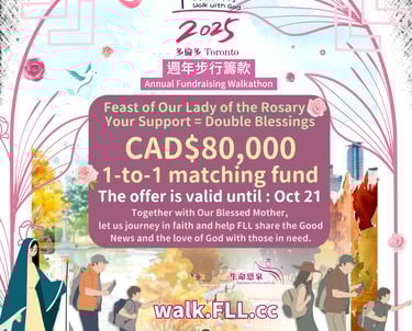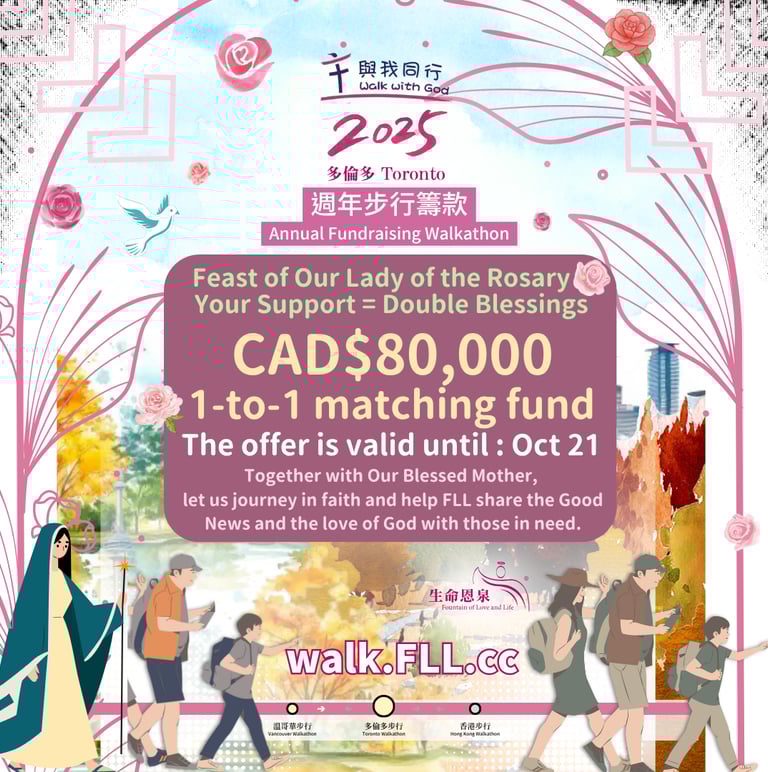 We thank our beloved Mother Mary for always walking with us. On this special day, Fountain of Love and Life (FLL) Toronto’s “Walk with God” campaign is blessed to have received a third round of matching fund!